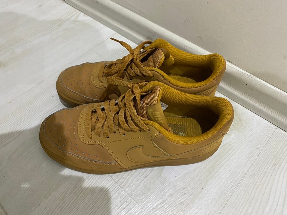 Kahverengi, parlak yüzeyli, bağcıklı erkek spor ayakkabısı. Kauçuk malzemeden, dolgu topuklu ve spor tarzına uygun. Orijinal sayılı giyinildi