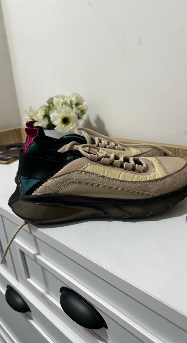 Kahverengi bağcıklı kadın spor ayakkabısı, fırfır detaylı ve ince topuklu. Kauçuk tabanlı, athleisure ve street wear tarzında.
