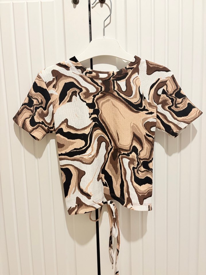 Bağcıklı detaylı, kısa kollu, bisiklet yaka, kahverengi tonlarında batik desenli dar kesim bluz. Sentetik kumaştan üretilmiştir.