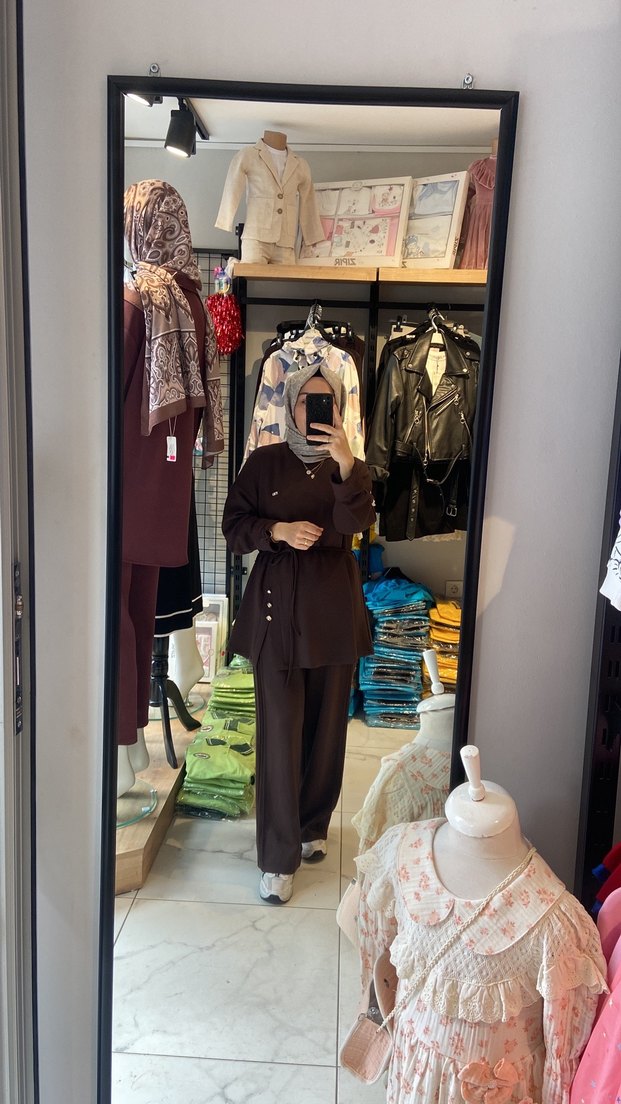 Kadınlar için uzun, kahverengi bağcıklı takım. Notlu yaka ve uzun kollu, sentetik kumaştan, bağcıklı ve bağlama detaylı, günlük ve iş stiline uygun.