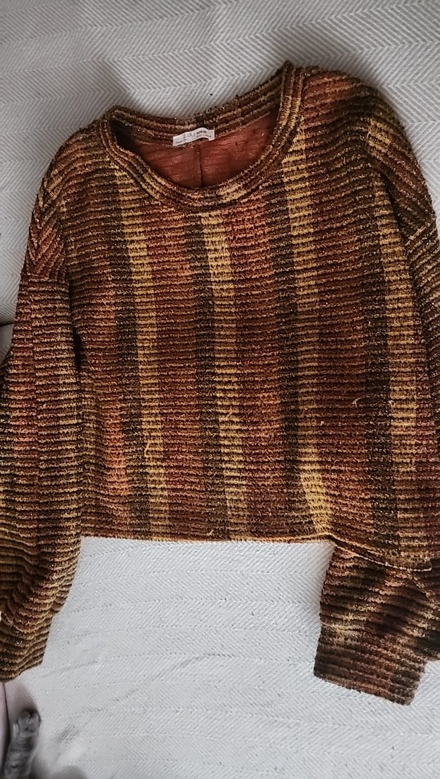 Kahverengi bağlama desenli, uzun kollu, yuvarlak yakalı, bol ve mini boy bohem tarzda örme kadın kazak. Günlük kullanıma uygundur.