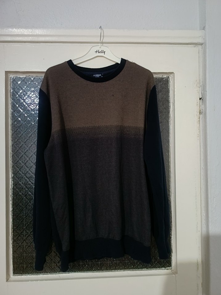 Bol kesim, yuvarlak yakalı ve uzun kollu erkek triko kazak. Kahverengi bağlama desenli, yün örgü kumaştan, sokak modasına uygun.
