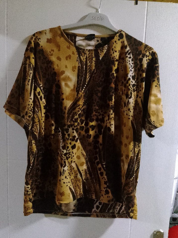 Kahverengi bağlama desenli, kısa kollu, yuvarlak yaka ve bol kesim kadın bluz. Sentetik kumaştan, vintage esintili drapeli tasarım.