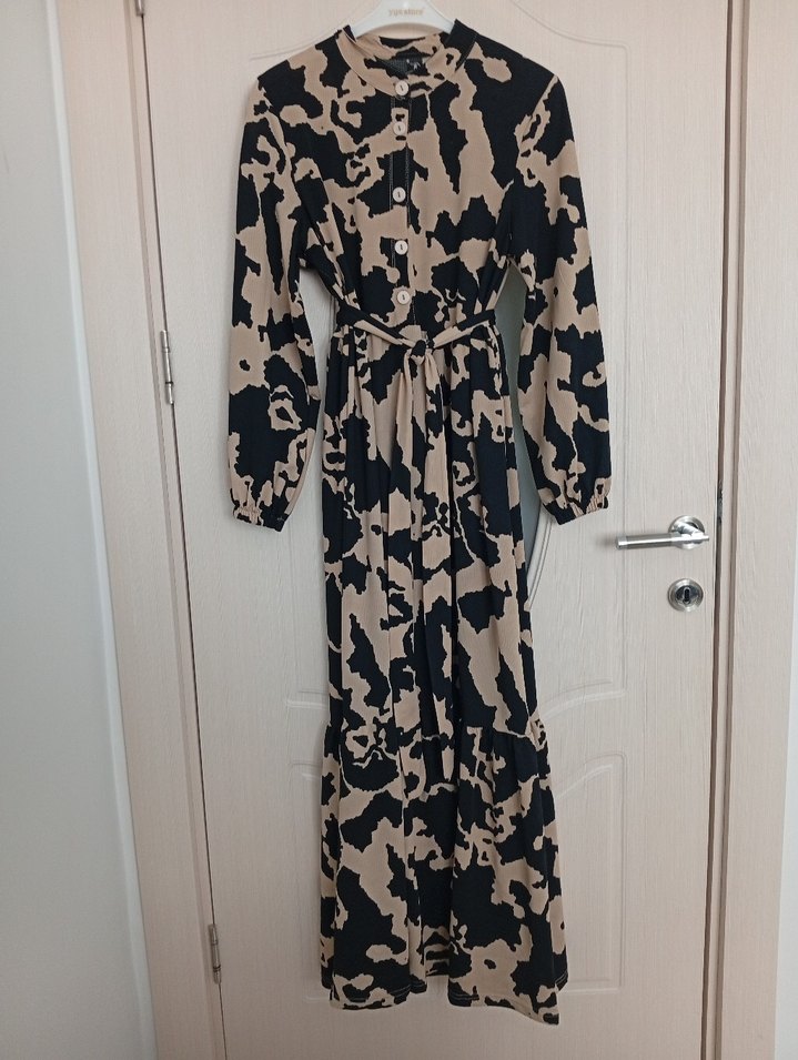 Uzun kollu, yüksek yakalı kahverengi bağlamalı uzun kadın elbisesi. Sentetik kumaştan, bol kesim ve günlük kullanım için uygundur.