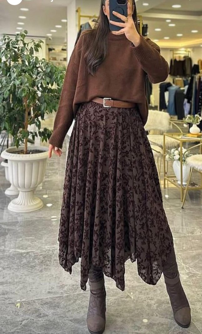 Kahverengi triko uzun etek, bol kesim ve koyu batik desenlidir. Bağlamalıdır ve günlük kullanıma uygun bohem, rahat stilde tasarlanmıştır. Rekor satan flok etek bel lastikli ve fermuarlli Geniş kalıp stok *Kahve* 4.seri geldi *Hemen teslim* M M L *Siyah* *Hemen teslim* S M *Bordo* *Hemen teslim* M