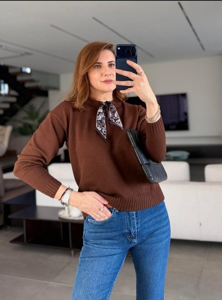 Kahverengi triko kazak, bağlamalı yaka detayı ve uzun kollu yapısıyla günlük kullanıma uygun rahat bir kesime sahiptir. STANDART BEDEN