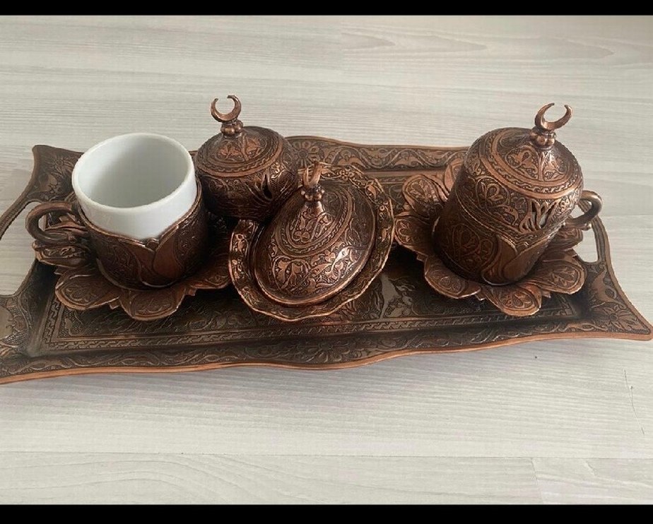 Kahverengi Bakır İşlemeli Kahve Seti