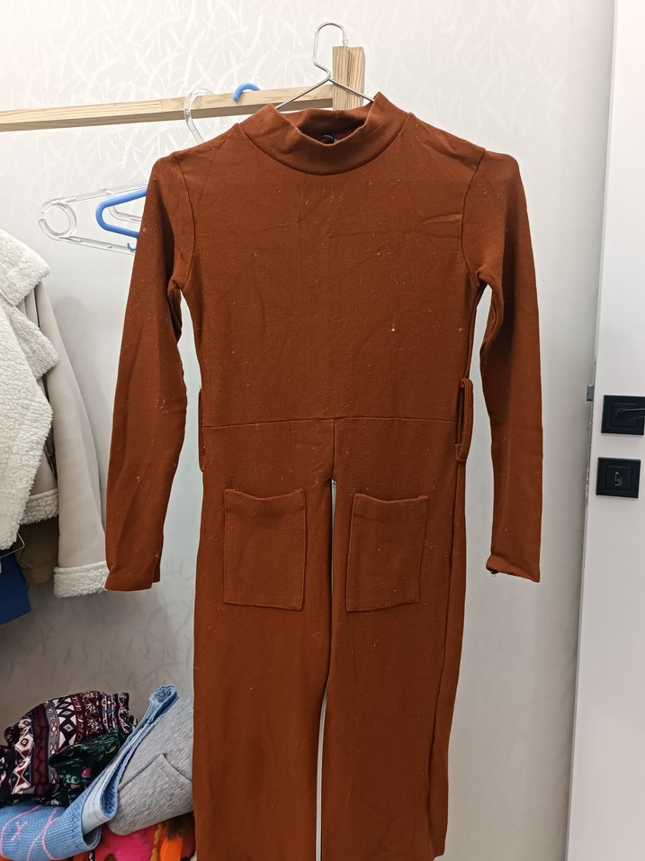 Bu balıkçı yaka, uzun kollu ve diz boyu kahverengi hamile tulumu, yumuşak ve sıcak kumaştan olup, iki ön cep içerir. Minimalist ve şık bir görünüm sunar.