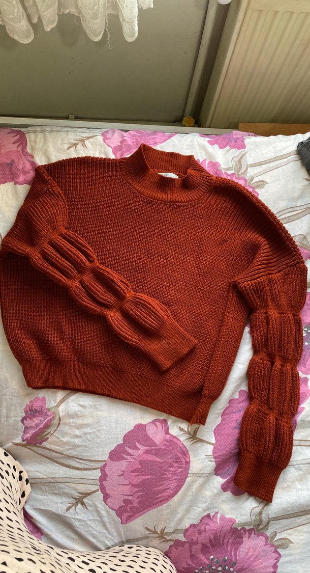 Kahverengi örgü, balıkçı yaka, uzun kollu, bol kesim kadın kazak. Günlük kullanım için uygun, rahat ve sokak stiline uyumlu.