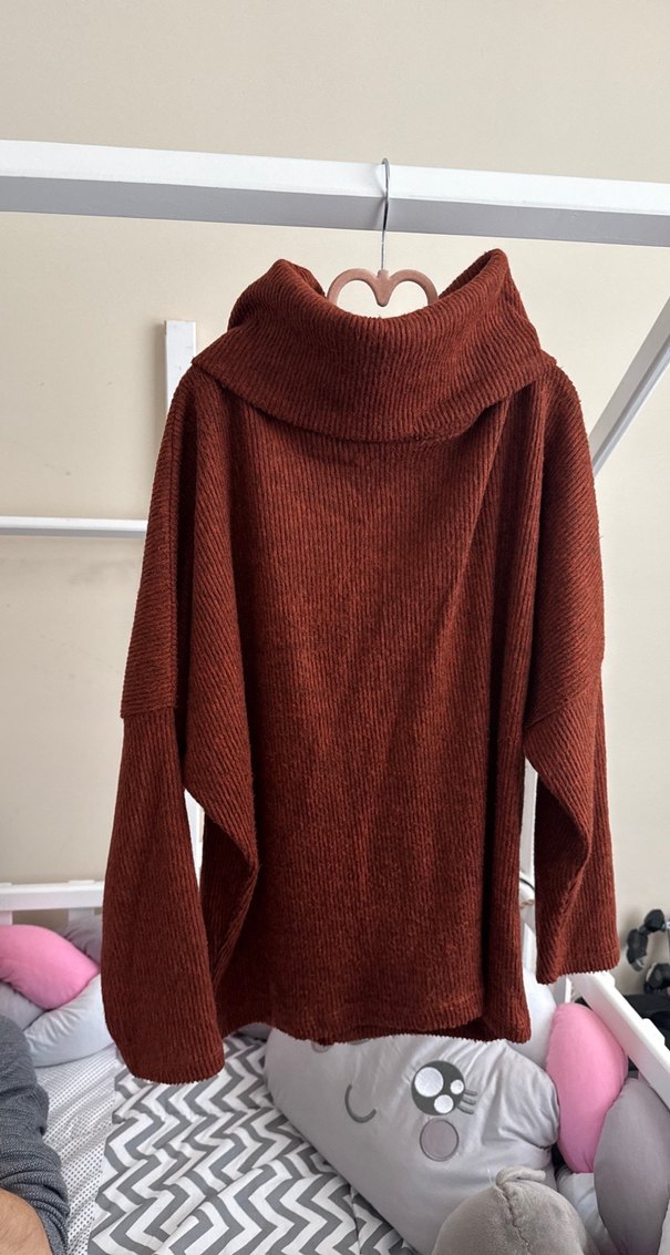 Kahverengi örgü kazak, rahat balıkçı yaka ve uzun kollu, yumuşak yünden yapılmıştır, günlük kullanım için uygundur.