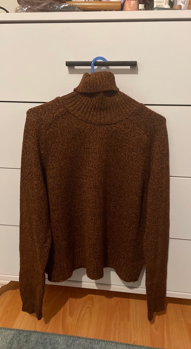 Kahverengi, balıkçı yaka ve uzun kollu, örgü dokulu, yumuşak yünden yapılmış, normal midi boyda, sade ve rahat stil kazak.