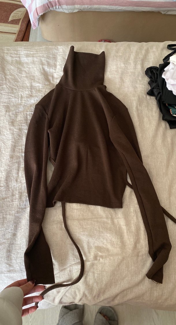 Kahverengi, balıkçı yaka ve uzun kollu, yumuşak triko kumaştan yapılmış dar kesim kazak. Normal boyda, sade tasarımlı, rahat sokak stili için uygundur. Sırt detaylıdır