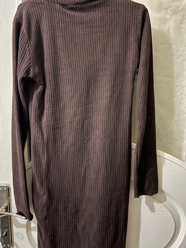 Kahverengi, balıkçı yaka ve uzun kollu, vücuda oturan triko uzun elbise. Desensiz, günlük kullanıma uygun rahat bir modeldir.