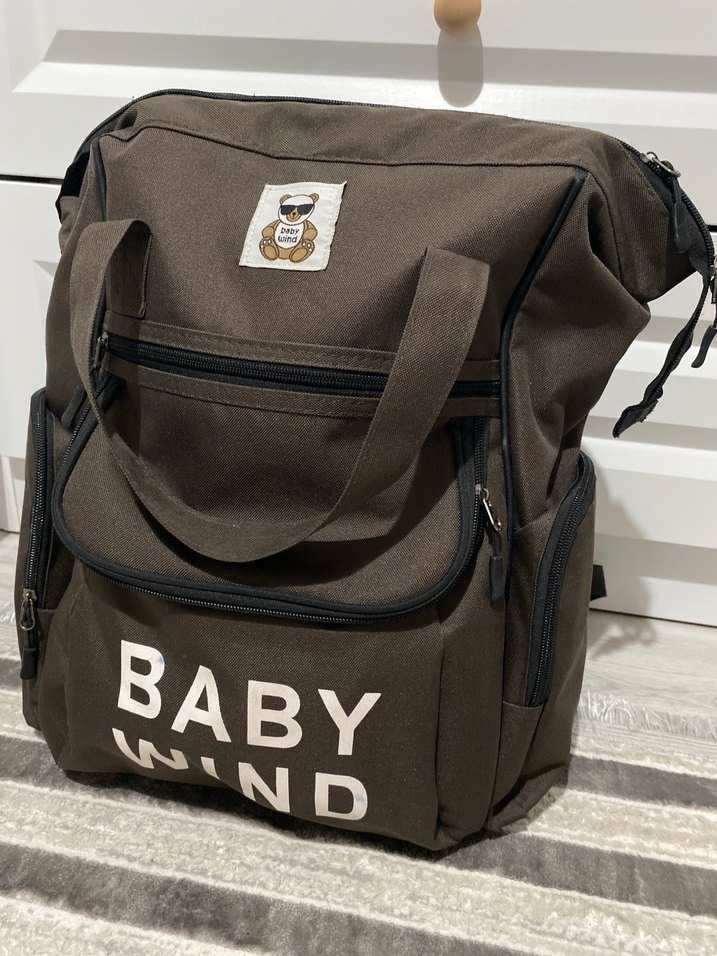 Kahverengi baskılı bebek çantası, "BABY WIND" yazısı ve ayıcık patch ile. Çoklu bölmeli, sağlam saplı ve yan cepli.