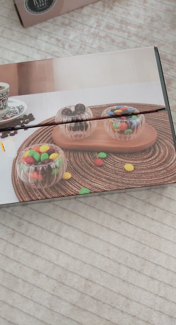 Bu çağdaş kahverengi baskılı tabak seti, atıştırmalıklar için uygun, yuvarlak ve şeffaf kase ile ahşap tabandan oluşur. ️