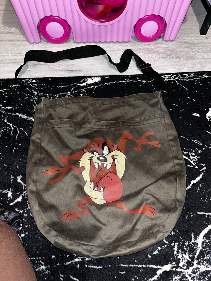Kahverengi baskılı çanta, ayarlanabilir siyah omuz askısına sahiptir geniş ve kullanışlıdır.