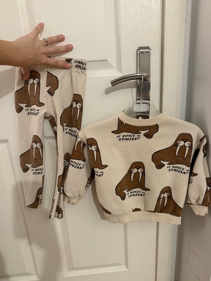 Kahverengi, uzun kollu, bisiklet yaka çocuk alt üst takım.Yumuşak kumaştan, bol kesim ve deniz ayısı baskılı. Örgü detaylar bulunur.