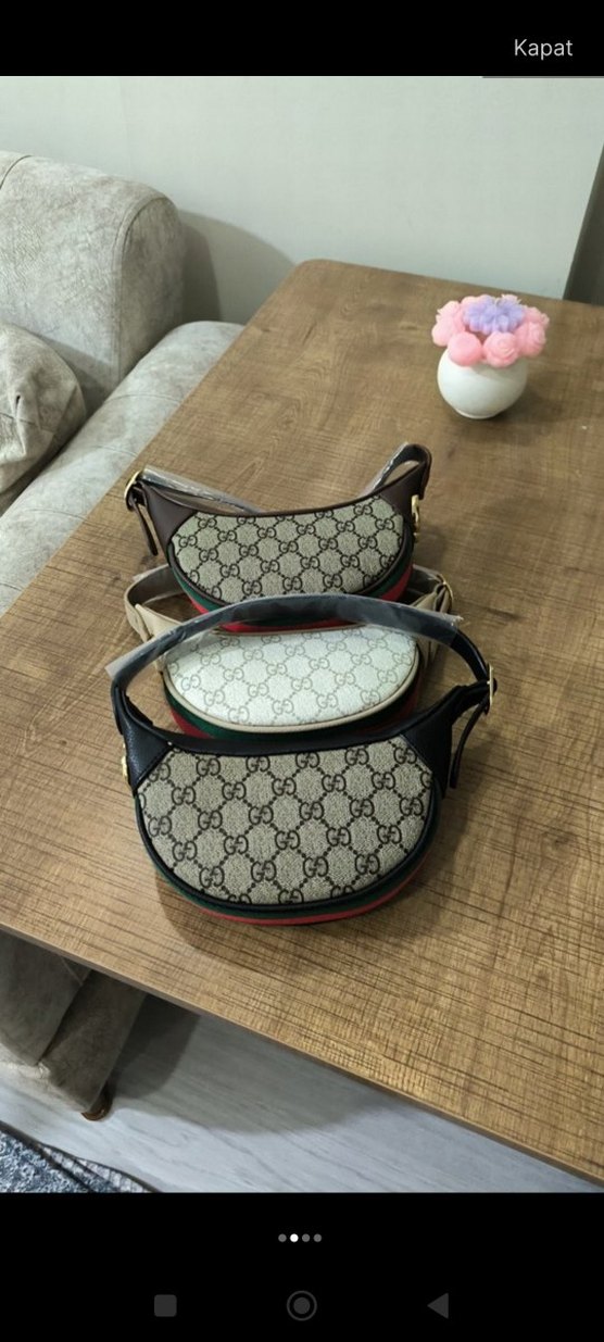Kahverengi ve gri baskılı deri, tokalı askılı kadın çantası. Klasik zarafet ve Paris sokak modası stilini yansıtıyor. Günlük kullanım için uygun.