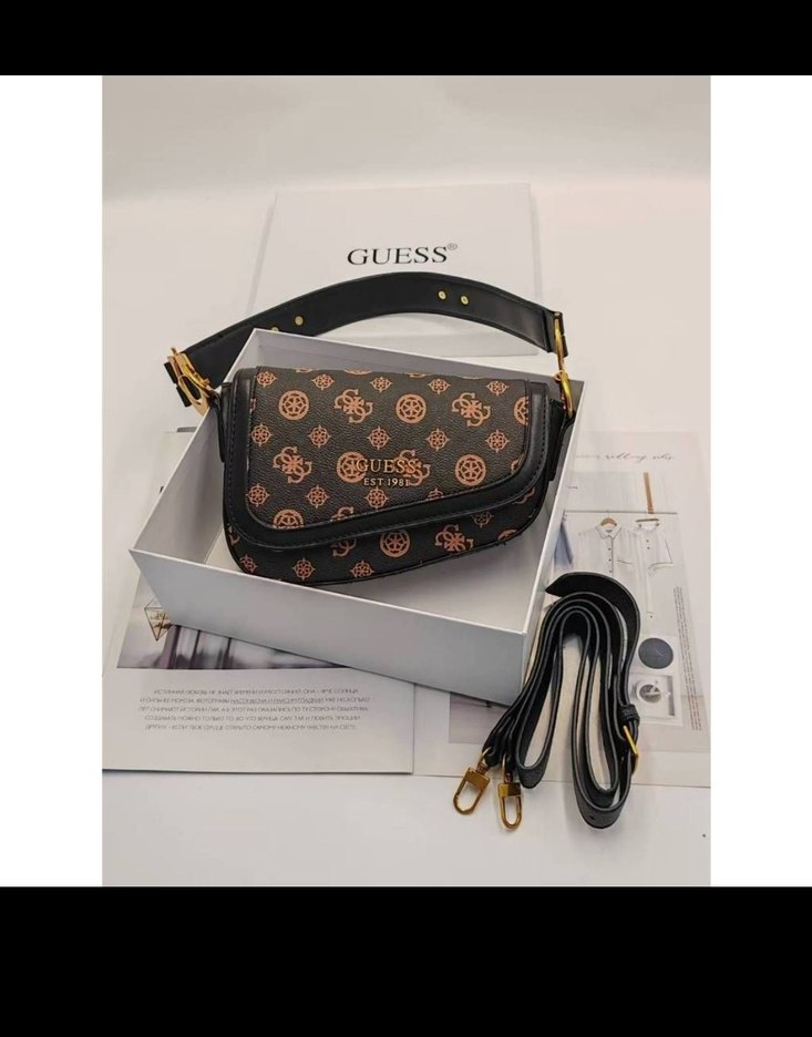 GUESS markalı, kahverengi baskılı deri kadın çanta, tokalı askısı ve gündelik kullanıma uygun şık sokak stiliyle tamamlanır.