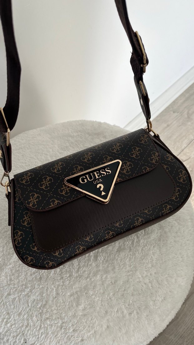 Kahverengi baskılı deri çanta, kemer detaylıdır ve klasik şıklık ile sokak stilini bir araya getirir. Günlük kullanım için uygundur.