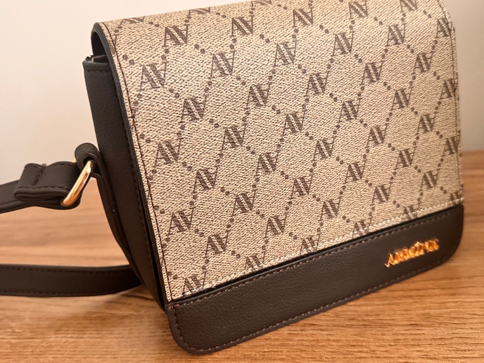 Kahverengi baskılı deri kadın çanta, tokalı detayıyla modern klasik tarzı ve ofis kullanımı için uygun.