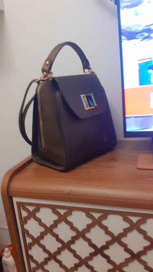 Kahverengi baskılı deri kadın çantası, tokalı kapak detayıyla klasik ve modern tarzı bir araya getirir.