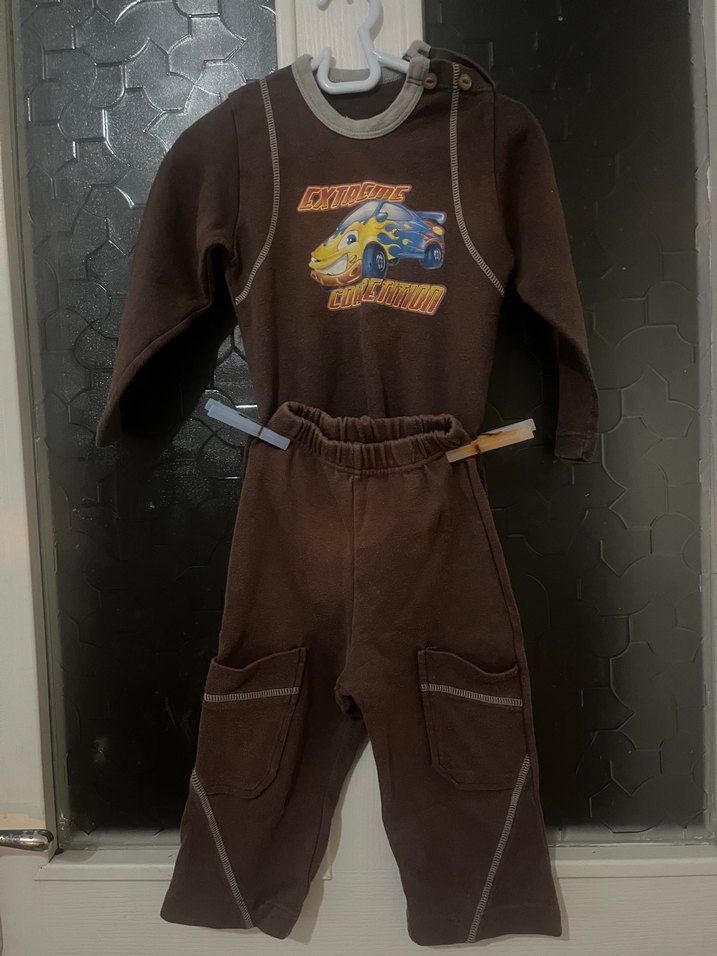Kahverengi, yumuşak ve sıcak kumaştan yapılmış, bisiklet yaka ve uzun kollu erkek bebek takımı. Önünde baskı deseni ve kemerli cepli pantolon bulunur.