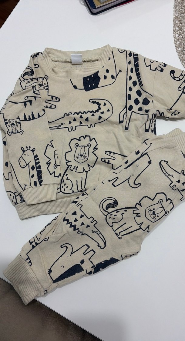 Uzun kollu, yuvarlak yakalı pamuklu kumaştan yapılmış kahverengi baskılı erkek bebek takımı.