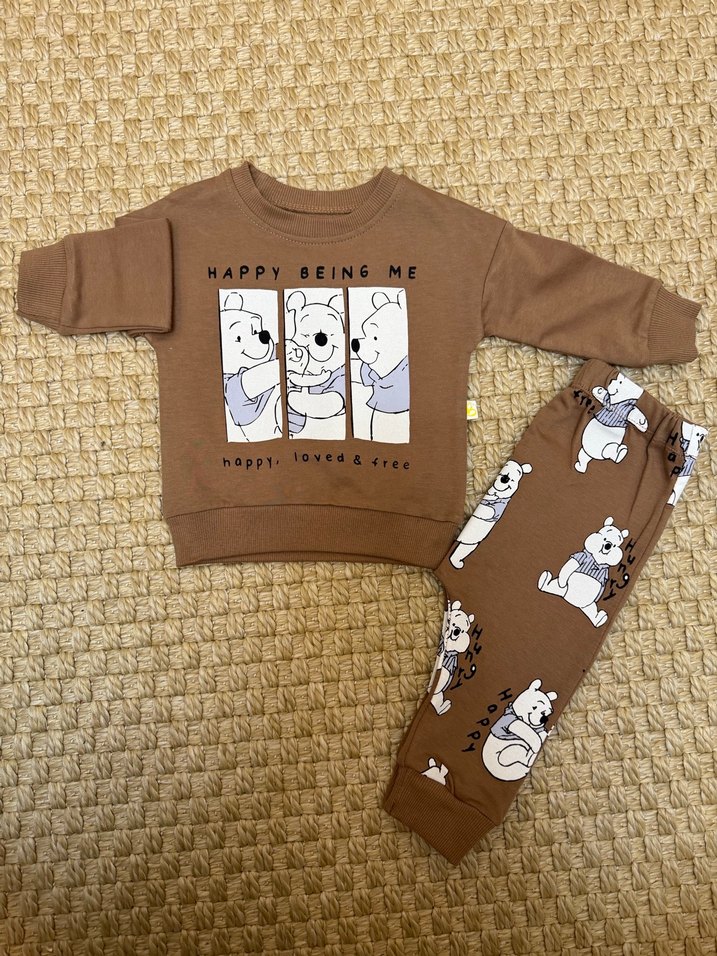 Kahverengi, baskılı, uzun kollu ve bisiklet yaka erkek bebek takımı. Yumuşak ve sıcak dokulu. beden: 9 aydan 2 yaşa kadar beden mevcuttur.