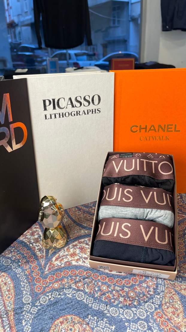 Kahverengi, baskılı ve koyu tonlarda, mini boy ve sıkı kesime sahip erkek boxer. "Louis vuitton”yazıları bulunur.