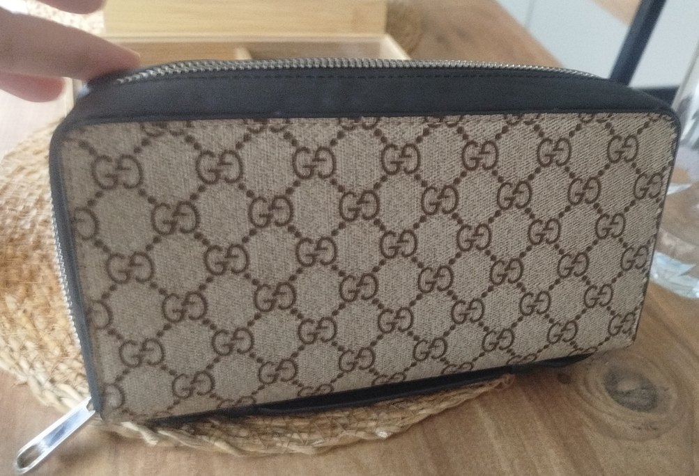 Kahverengi ve gri tonlarda, baskılı desenli, fermuarlı sentetik kumaş kadın clutch cüzdan. Günlük kullanım için çağdaş ve klasik Paris tarzını yansıtır. aslında erkek ürün fakat unisexde kullanılır hiç kullanılmadı sıfır urun birebir
