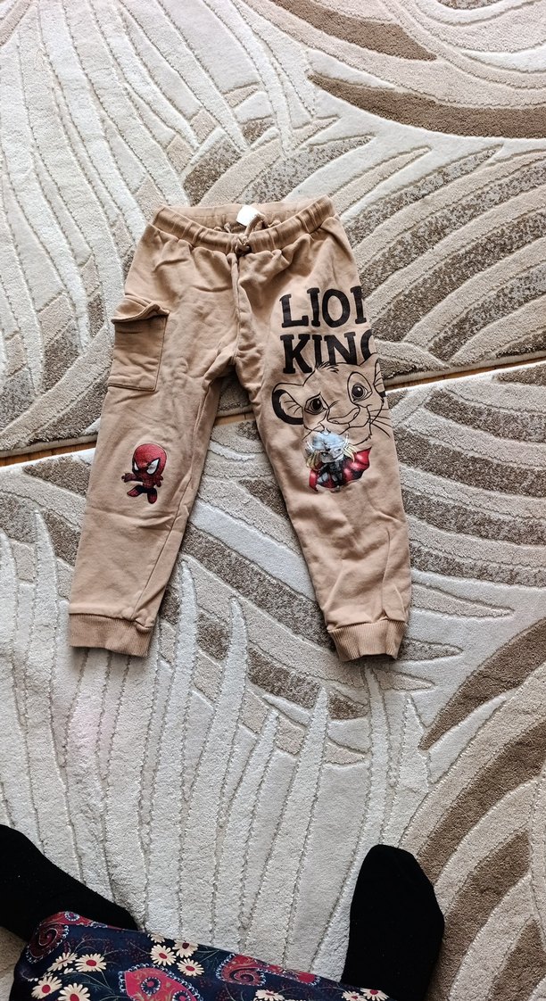 Kahverengi, bol kesim, baskılı Lion King ve süper kahraman desenli erkek çocuk eşofman altı, cepli detaylı. Rahat ve yumuşak kumaş.
