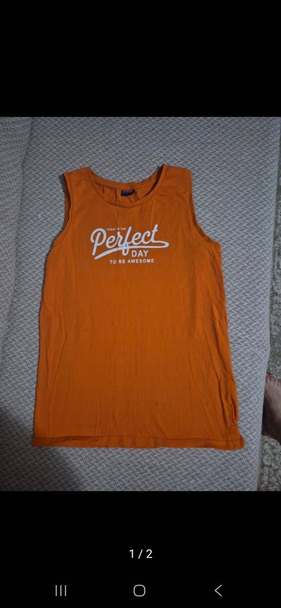 Kahverengi parlak renkte, sentetik kumaştan yapılmış, kolsuz erkek çocuk tişörtü. Önünde baskılı yazı ve kemer detayına sahiptir. ✨