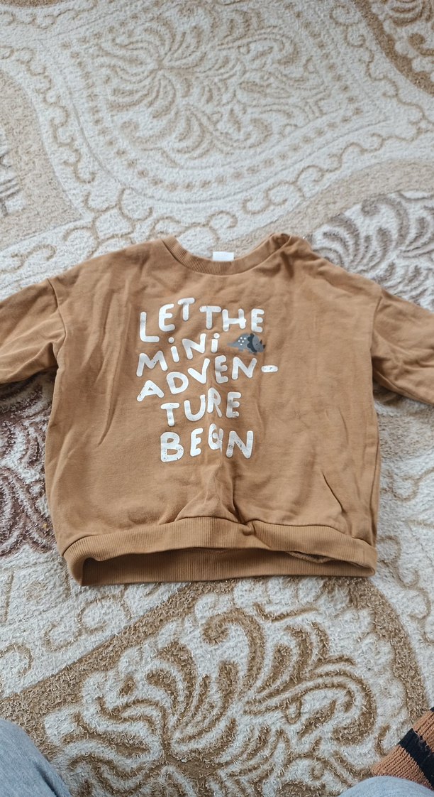 Kahverengi, uzun kollu, bisiklet yaka ve bol kesim erkek çocuk sweatshirtü. Yumuşak, örgü detaylı kumaştan, önünde baskılı yazı bulunur.
