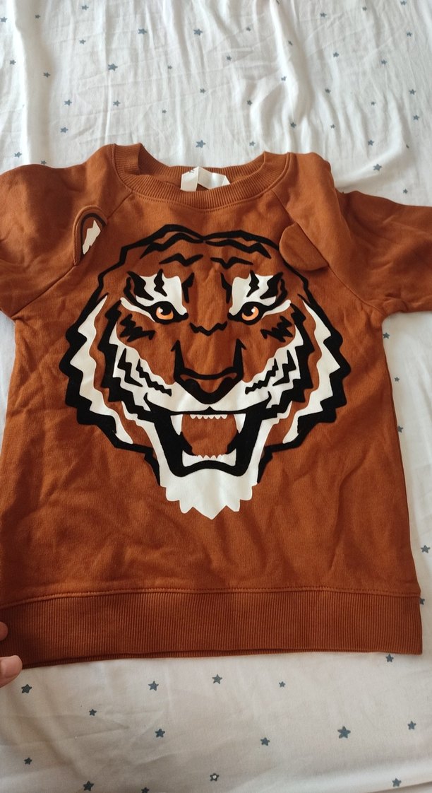 Kahverengi, kaplan baskılı erkek çocuk sweatshirtü, bol kesim, uzun kollu ve yuvarlak yaka. Yumuşak ve sıcak kumaştan, kol detaylarında kürk bulunur.