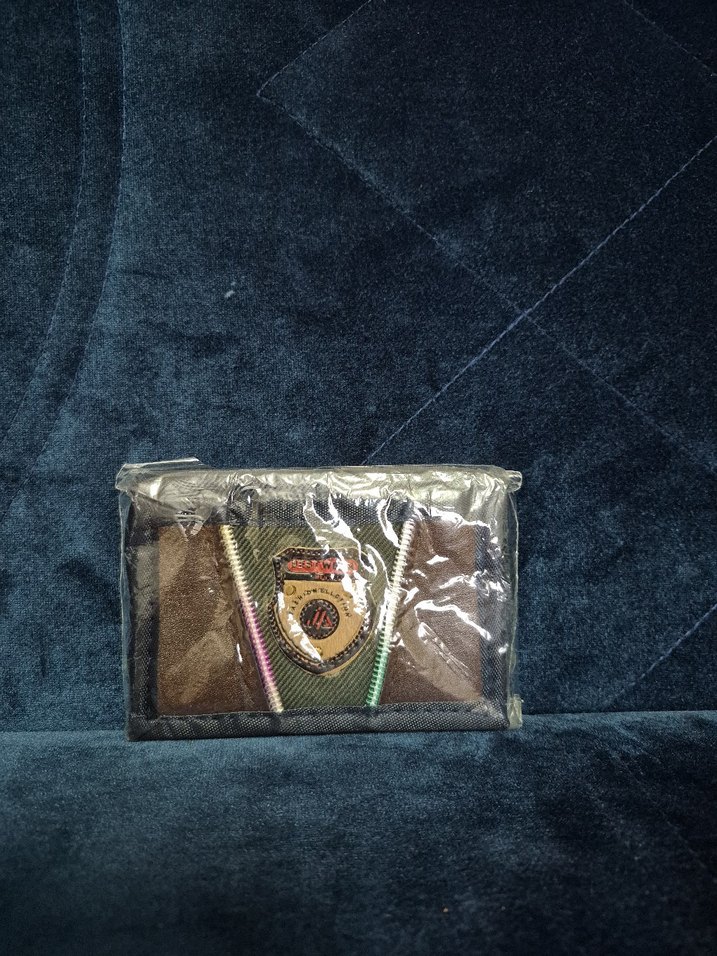 Koyu kahverengi, baskılı detaylara sahip erkek cüzdanı. Rahat ve karşı kültür tarzıyla renkli vurgular ve önünde küçük bir amblem bulunur.