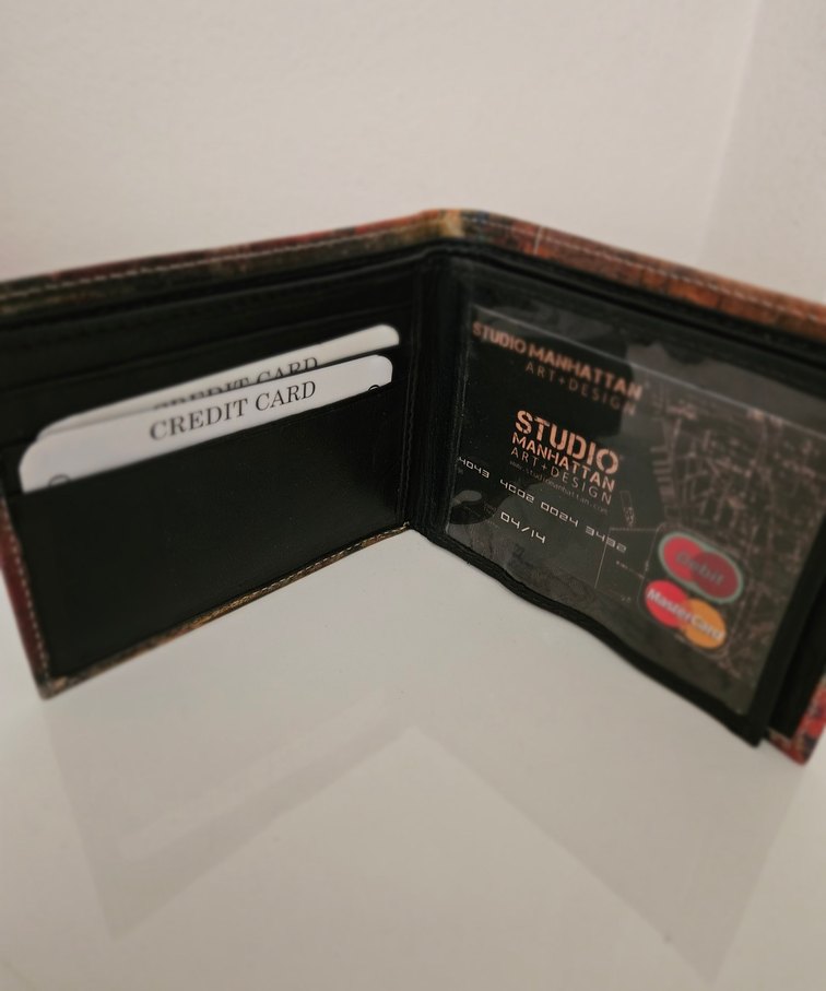 Kahverengi baskılı erkek cüzdan, kredi kartı bölmeleri ve şeffaf kimlik penceresi içerir. Sokak stili etkileri taşır.