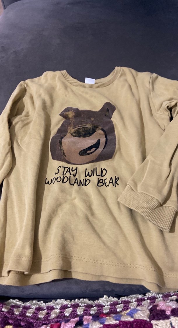 Kahverengi, uzun kollu, yuvarlak yaka ve bol kesim erkek sweatshirtü. Önünde 'STAY WILD WOODLAND BEAR' yazılı baskılı orman ayısı deseni bulunur.