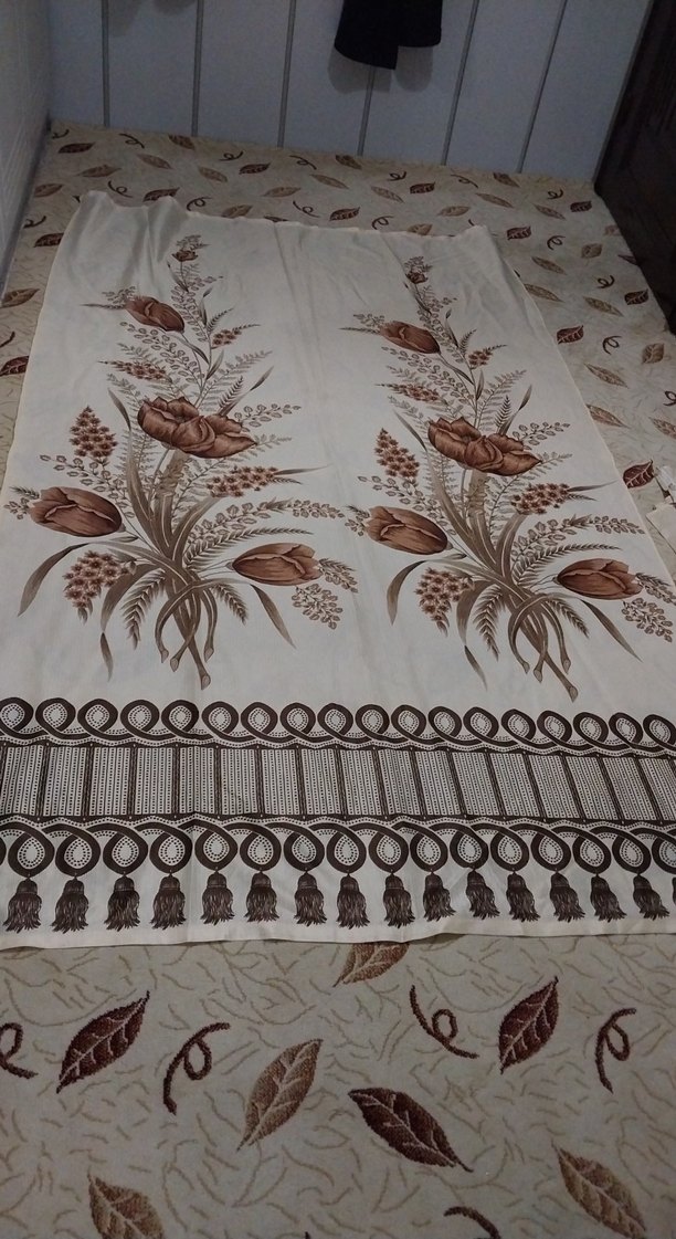 230*136 2 adet fiyatı Bu perde, açık kahverengi tonlarda baskılı çiçek desenine sahip geleneksel bir tarzdadır. Alt kısmında dekoratif bordür detayları bulunur.