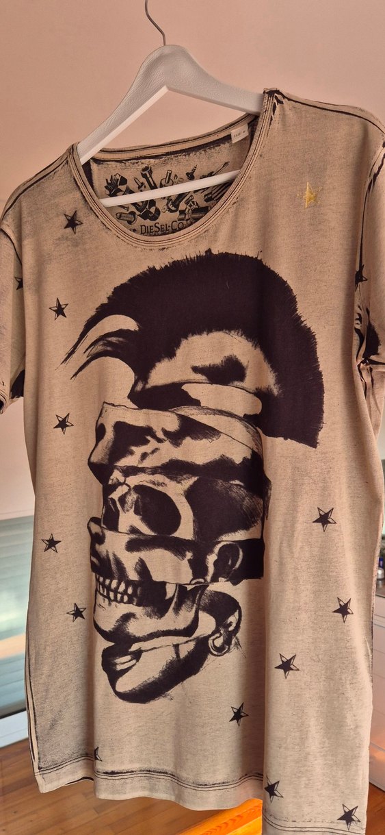 Kahverengi, baskılı, bol kesim Diesel Tişort Yuvarlak yaka, kısa kollu, pamuklu ve ince yazlık kumaş.Günlük kullanıma uygundur.