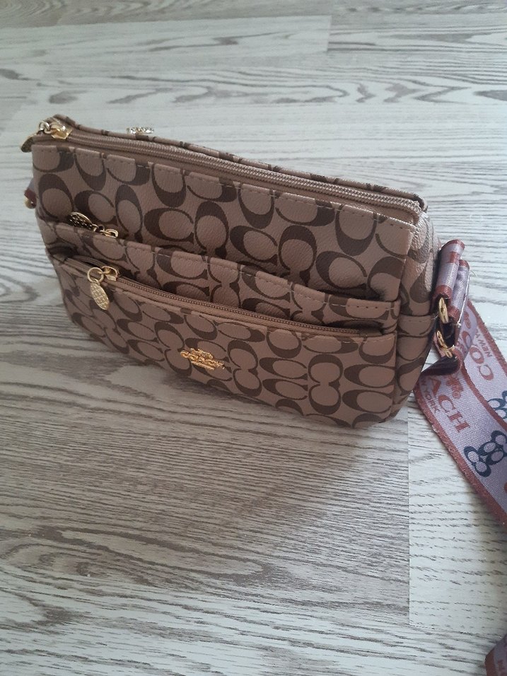 Kahverengi baskılı, tokalı kadın çanta. Sentetik kumaştan, çoklu fermuarlı cepleri ve gri askısı ile trendy günlük kullanıma uygun. bir kere kullandim