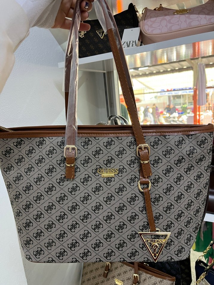 Kahverengi baskılı, tokalı askılı, sentetik kumaştan yapılmış kadın çantası. Klasik zarafetiyle günlük sokak stiline uygundur.