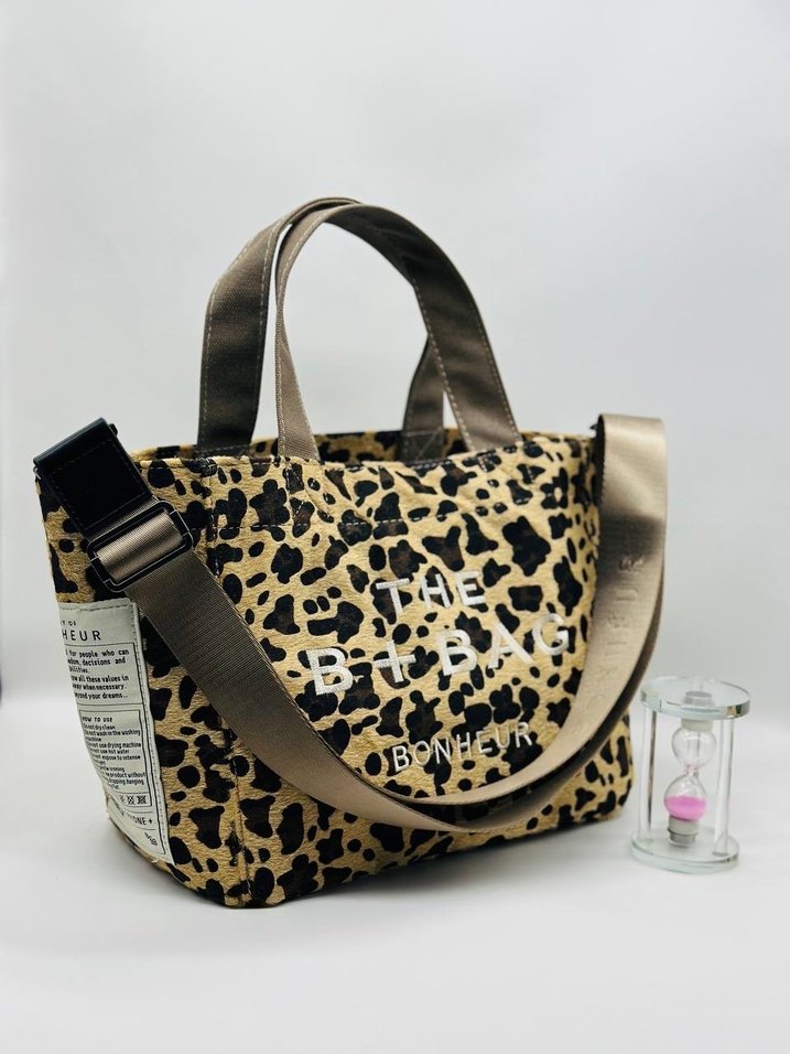 Kahverengi baskılı sentetik kumaştan yapılmış, çift kulplu ve ayarlanabilir askılı, günlük kullanıma uygun sokak modası tarzında kadın çantası.