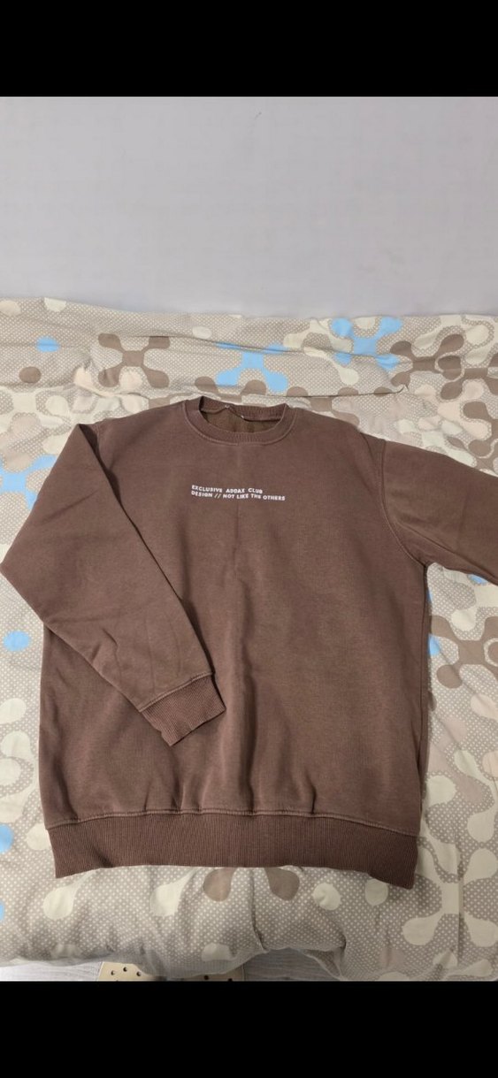 Kahverengi baskılı kadın sweatshirt, uzun kollu ve yuvarlak yakalıdır. İçi polarlı. L beden. Addax markası. Hiçbir yerinde leke yada deforme yok.