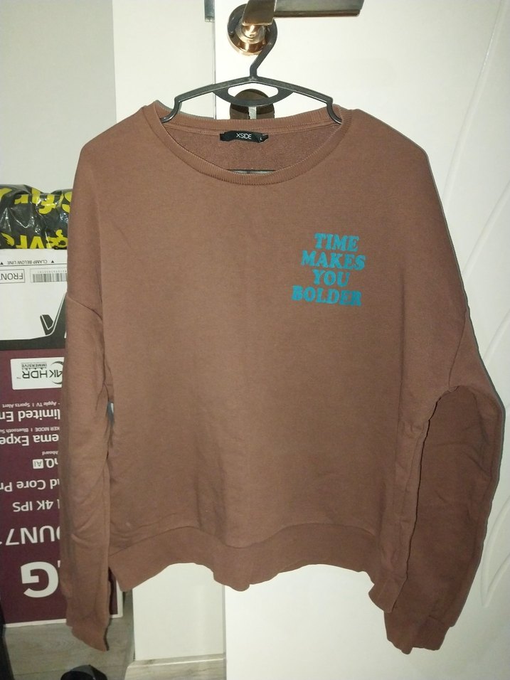 Kahverengi, baskılı, yuvarlak yaka ve uzun kollu, rahat kesim kadın sweatshirt. Yumuşak ve sıcak dokusu günlük sokak tarzına uygun.