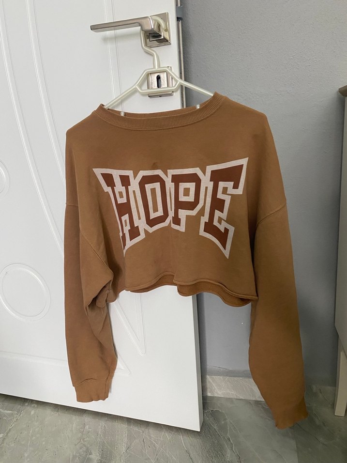 Kahverengi, crew neck ve uzun kollu kadın sweatshirtü. Bol kesim ve önünde 'HOPE' baskısı bulunur. Yumuşak, örme tüylü kumaştan, günlük rahat athleisure tarzda.