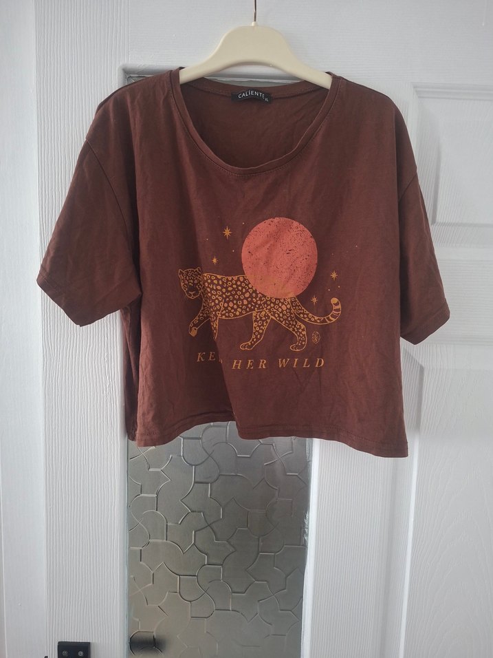 Kahverengi süet kumaştan, kısa kollu, yuvarlak yakalı bol kesim tişört. Üzerinde leopar ve güneş baskısı ile "HERWILD" yazısı bulunur.