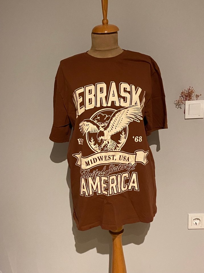 Kahverengi, kısa kollu, baskılı vintage tasarımlı kadın tişörtü. Rahat kesim ve yuvarlak yaka, günlük kullanıma uygun.