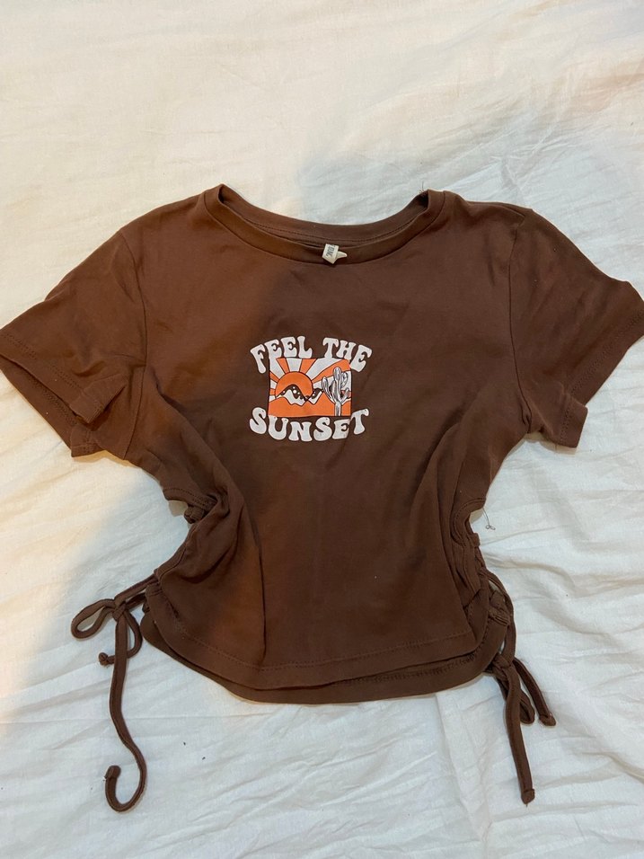 Kahverengi süet kumaştan, kısa kollu ve bisiklet yakalı bu tişört, yanlarda kemerli detaylara sahiptir. Üzerinde 'Feel the Sunset' baskısı bulunur.