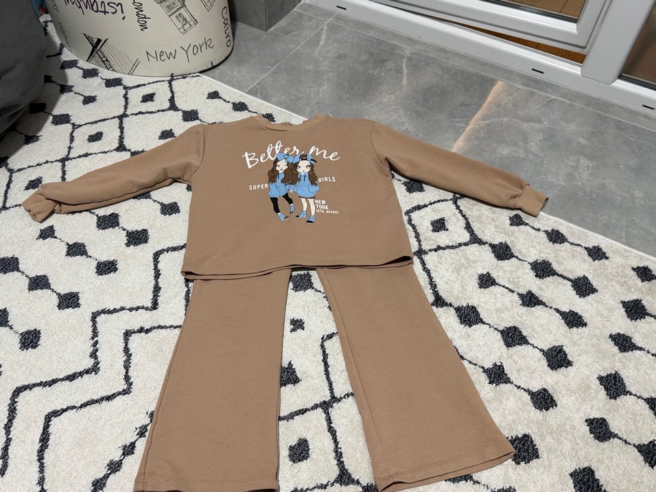 Kahverengi sentetik kumaştan, bol kesim, uzun kollu, bisiklet yaka, baskılı ve kemerli kız eşofman takımı.